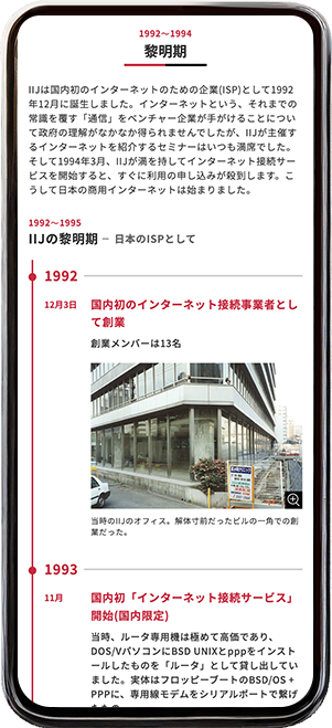 「IIJの出来事」と「世の中の出来事」を並行に配置し、当時起きた出来事を比較しやすいレイアウトとしています。