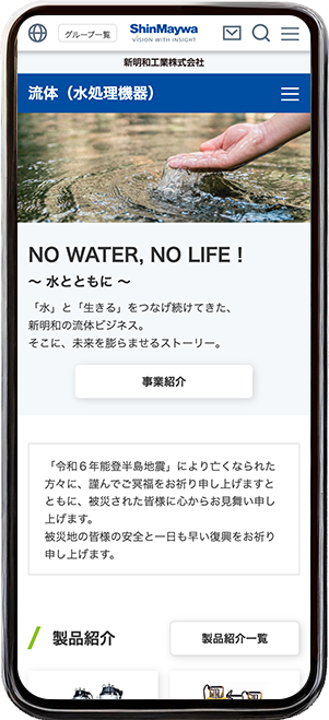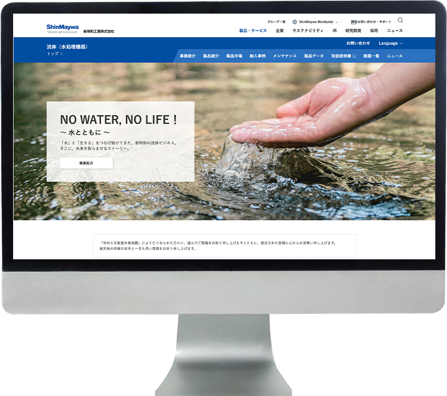 新明和工業株式会社様 「流体(水処理機器)」ページのページデザインを担当しました。